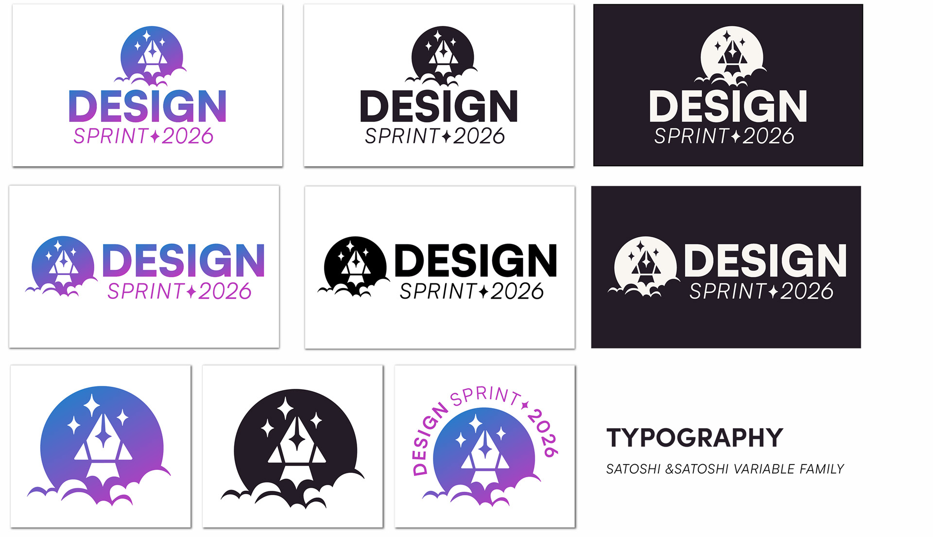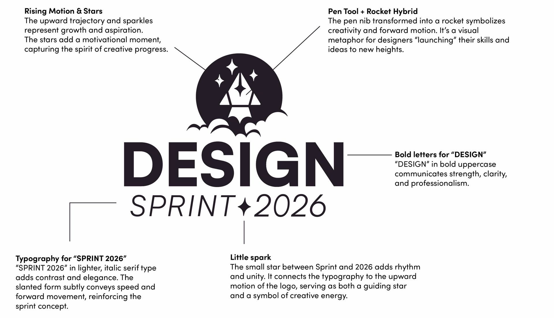 ✅ I developed the entire visual concept and logo identity for Design Sprint 2026. This included research, idea generation, sketching, shape exploration, and creating a refined black-and-white logo system that expresses creativity, movement, and professional growth.
