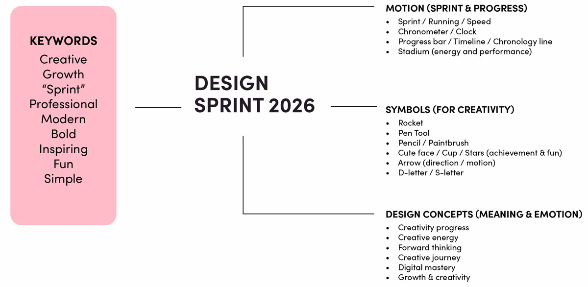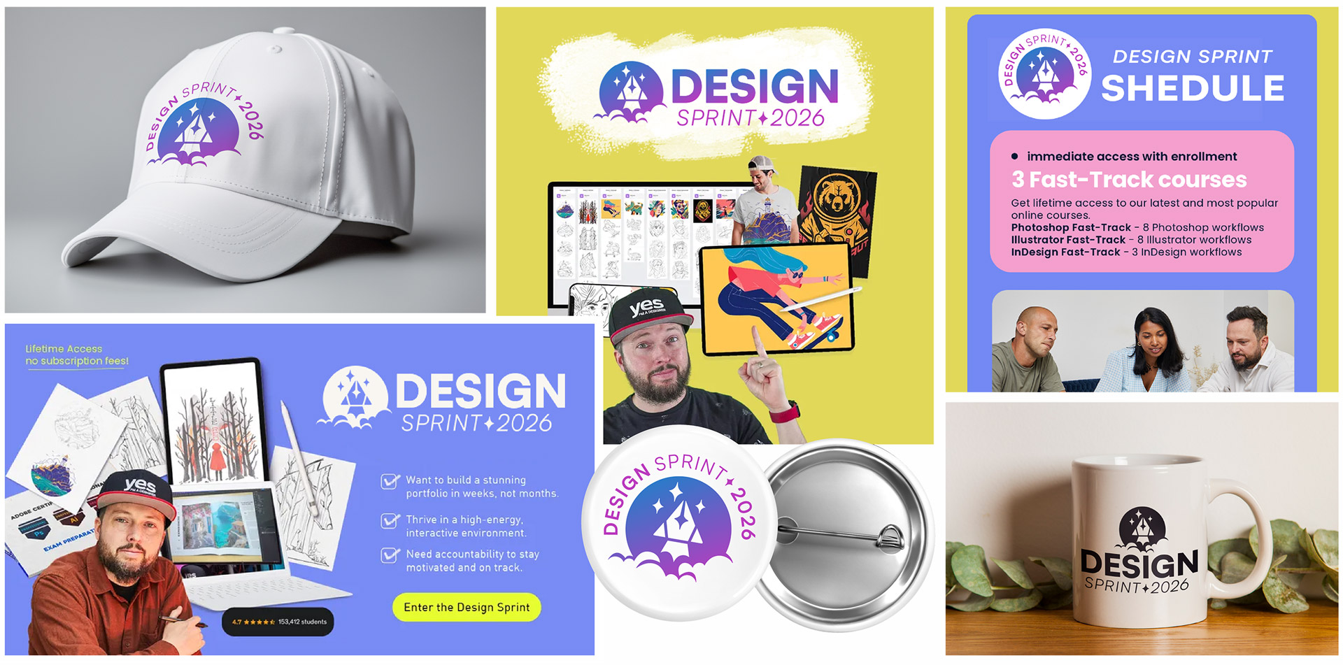 Design Sprint 2026 is a major virtual creative workshop – a three-week intensive learning experience focused on Adobe Photoshop, Illustrator, InDesign, and modern AI tools. The identity needed to communicate creativity, momentum, growth, and professionalism, while also capturing the energy and inspiration participants feel as they kickstart their new creative year.